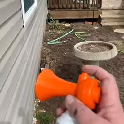 A man knocks down a hornet's nest with a pool skimmer and screams and runs and his wife tells him to jump in the pool and he does and says he got stung many times in the backyard. Security footage.