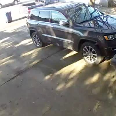 A woman in the driveway drives a golf cart but loses control and jumps out. The golf cart knocks down the pillars on the front porch. The fiancée apologizes to a man. Security Footage.
