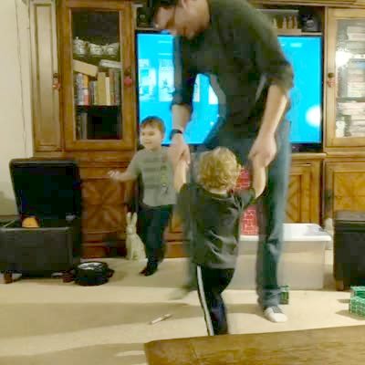 A man dances with a tot boy in the living room and accidentally bumps into a young boy with his butt and knocks him down. Music rights not cleared.