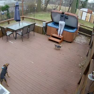A woman stands on some steps on the back deck, as she opens the hot tub lid. She slips off of the steps and the lid falls on her and she stands up out of the hot tub.