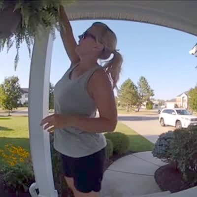 A woman waters a plant on the front porch and screams when a bird flies out of a planter.