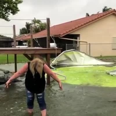 A woman cuts open a pool in the backyard and green water sprays all over her. The water from the pool floods the entire backyard.