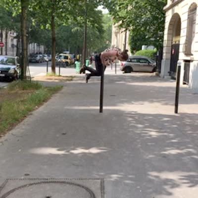 A woman runs and jumps onto a pole in the middle of the sidewalk. She then slides down the pole, head first into the ground.