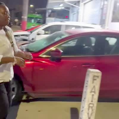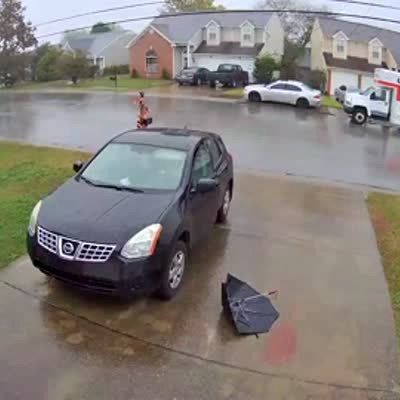 A woman gets out of the car and falls in the driveway and breaks her umbrella. She gets back into the car and throws her umbrella out onto the driveway and drives away.