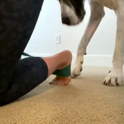 A woman does a workout in the bedroom with an elastic band. Her Great Dane dog gets hit by her foot and pulls at the band till it snaps back at her.