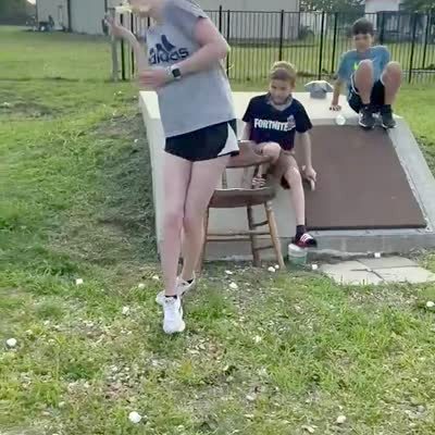 A woman off-camera throws a marshmallow and a teen girl tries to catch it and misses and the woman throws an egg and it breaks on the girl's face and she spits it out in the backyard.