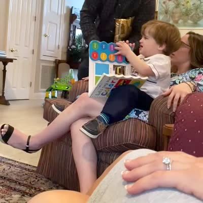 A man scratches a card and says "you're gonna have a baby?" and a woman stands up with a tot boy in her lap and throws him on the floor in the living-room.