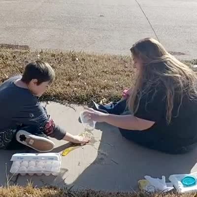 A young boy and a woman do the egg smash challenge and the boy smashes the egg and hangs his head in defeat and they high five on the sidewalk.