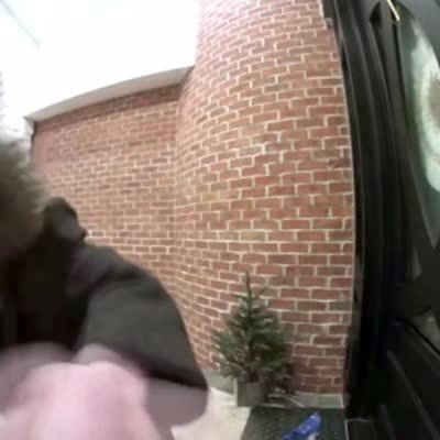 A young man leaves a gift at a front door and rings the doorbell. He runs away, but slips and falls off of the steps. Security footage.
