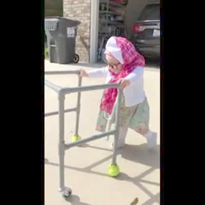 A tot girl in an old lady costume walks with a walker outdoors and then trips and falls as she looks at her mom. Halloween.
