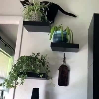 A cat jumps onto a shelf int he kitchen and it breaks as a woman yells at him. Foreign language.
