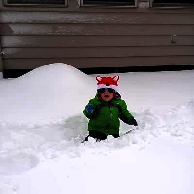 A tot boy stands in the snow and a woman asks him if he is having fun and he screams "No!" and she asks him if he likes snow and he screams even louder in the backyard.