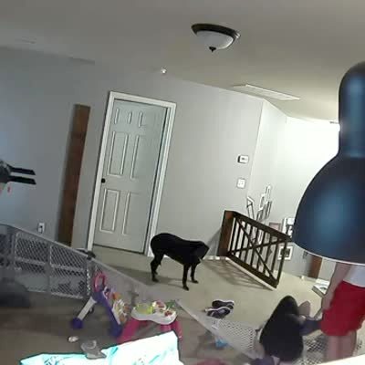 A woman tries to run and jump over a child safety gate but lands on top of it and breaks it. Security footage.