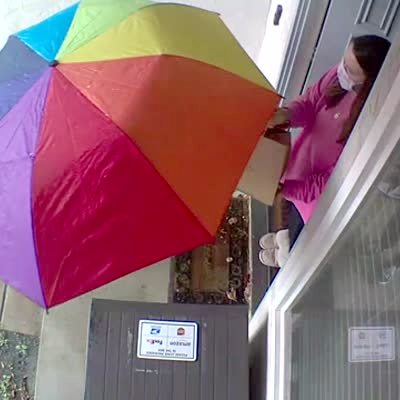 A woman with a rainbow umbrella carries a bag with Tupperware full of food on a porch and hands it to another lady in a doorway and the bag tears and falls on the floor and the food spills. Security footage.