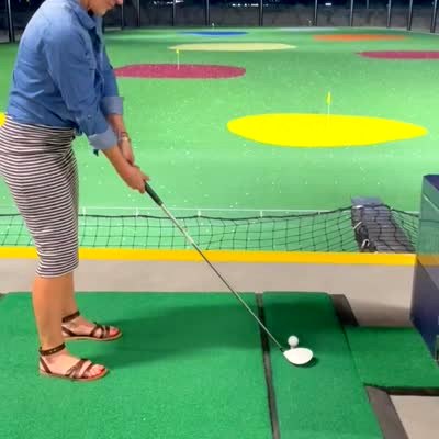 A woman tees up a golf ball at an outdoor driving range. She swings, misses the ball and the head of the club comes off and flies onto the range.