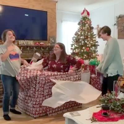 Two teen girls open a Christmas present in the living room that makes the sound of a goat. A woman comes out of the present and surprises them.