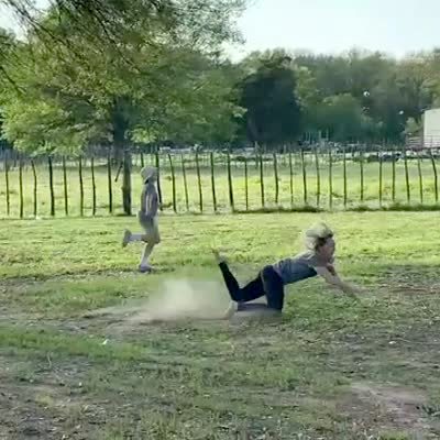 A woman outdoors runs up to a pole and attempts to hop over it, but hits the top and falls face first into the ground. Featured talent cleared only (the woman who jumps over the pole).