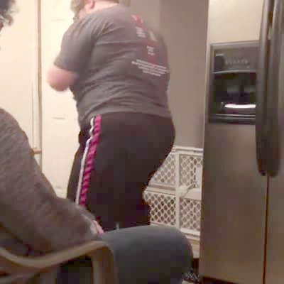 A woman dances to Beyonce in the kitchen, and falls backwards as she knocks over a fence.