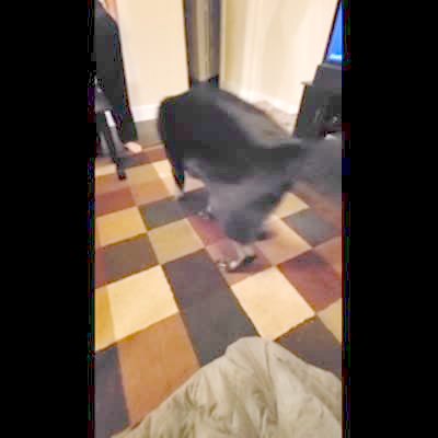 Small black dog leaps across the top of the stairs. All you see is dog flying through the air back & forth very fast. Dog is following laser pointer beam.