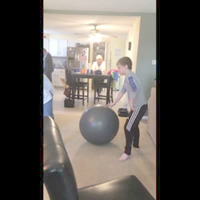 A man and a young boy jump on an exercise yoga ball. The last time he does it, the young boy kicks the ball out from under him and the man belly flops on to the floor.