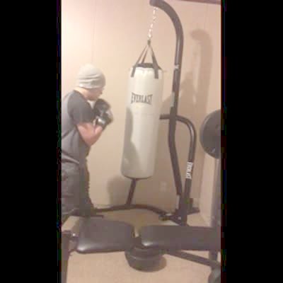A man hits a punching bag repeatedly. On his last punch, he misses the bag completely and falls down.