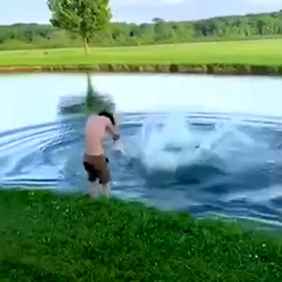 A group of teen boys jump over one boy and into a lake. The last teen hits the boy and they both fall into the water.
