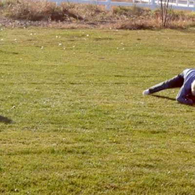 A woman tries to squeeze through her broken wooden gate. The gate is stuck so she forces it and when the gate breaks and falls down she falls with it and into the driveway. She raises her arms in triumph. Security footage. Inappropriate language.