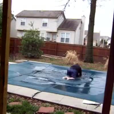 Woman tries to run across a pool covering and falls. Background women laugh very hard. Their laughter is funnier than the action of the clip.