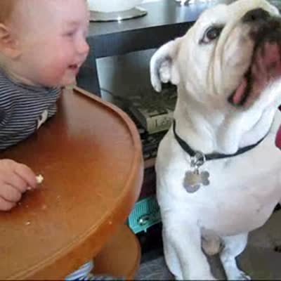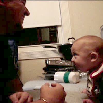 Dad hits his hand to his mouth to make silly noises, then he puts his hand to baby boy's mouth & baby repeats it.