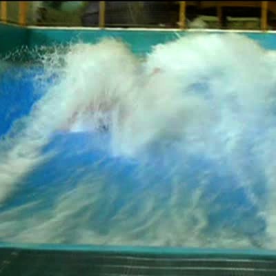 "Waves of Laughter" A man body boards in man-made wave pool. He slips off board and gets tossed around the wave pool and can't get out.