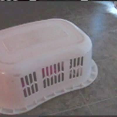 "Tiny Toddler Trapper" A tot girl turns a laundry basket on its side in the living room indoors and throws a graham cracker in the basket. She calls her younger brother over and he crawls into the basket to get the cracker and she turns it over and traps him under the basket.