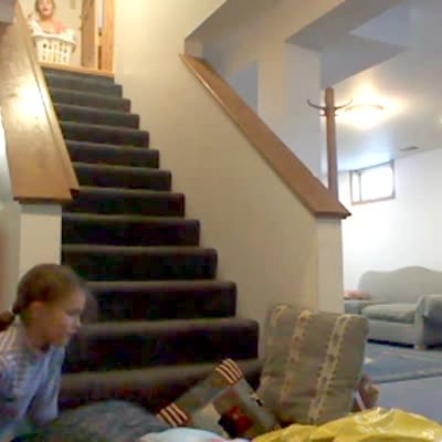 A girl pushes a boy down indoors stairs in a laundry basket. He falls out and hits the camera.