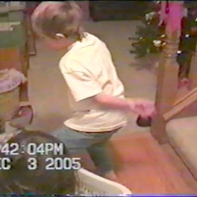 Young boy goes down stairs in a laundry basket. His first run is good but the second time he falls all the way down the stairs. With recovery. He laughs.