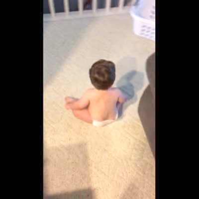 Baby girl walks around house pushing a laundry basket. She falls & the basket flips on top of her, trapping her in cage. Cute. Long clip