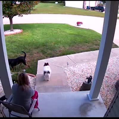 Two small dogs run from the street and through a small front yard. A Rottweiler dog leashed to a lawn chair runs after them, dragging the lawn chair behind it. A woman, who has picked up and carries one of the small dogs, is tripped by the dragging chair and she falls to the ground. She drops the small dog and it runs back into the street. Security footage.