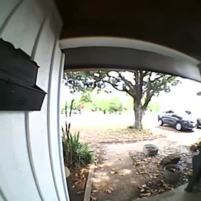 A talking mechanical scarecrow Halloween decoration sits in a lawn chair on the front porch of a house, with a censor on the doorstep, to activate it. A young girl in an inflatable costume trick-or-treats, and walks to the house. The scarecrow jumps and screams, and the girl screams and runs from the house. Secondary source, from home security camera.