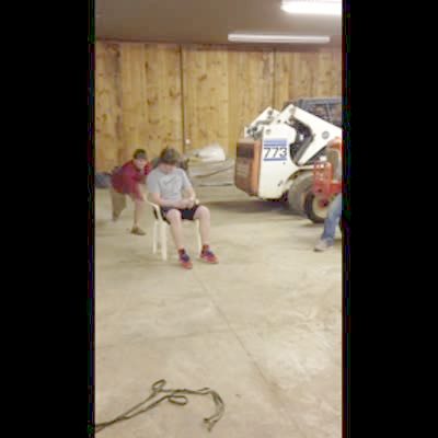 A man sits in a lawn chair outdoors and explains he's going to do an ice bucket challenge while a teen boy and a young man stand on a tractor behind him with a large metal tub of water. The man in the lawn chair pretends to read a newspaper as they struggle to tilt the tub of water, but when they do, it crushes the man and the camera cuts away but cuts back to show the man drenched on top of his broken lawn chair.