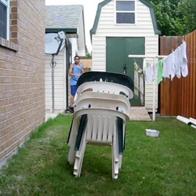 A man sits in a broken plastic lawn chair on a patio. A woman asks him how he will get out of it, and he says "slowly," then he falls on the ground as it breaks further.