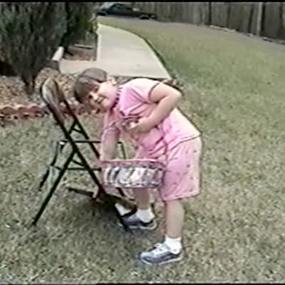 Chubby tot girl sits in chair on lawn. The cushion isn't on the chair it is just set on it and she falls through the chair. No tails