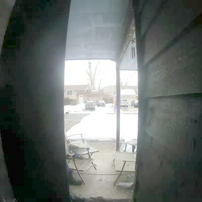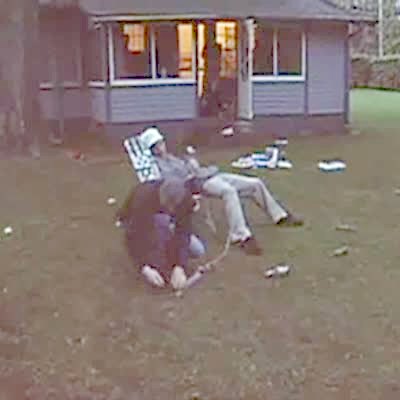 A woman sees a rat and screams, then she leans back in a lawn chair and falls in a front yard. Security camera footage.