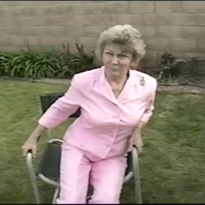 A senior woman sits in a lawn chair in her backyard. She accidentally kicks a cinder block and then her char breaks and she falls through it. Security Footage.