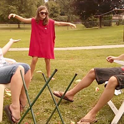 A young girl stands on a lawn chair and pours a bucket of ice water on her friend outdoors. The chair tips over and she falls on her butt. ALS Ice Bucket Challenge.