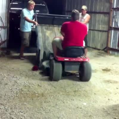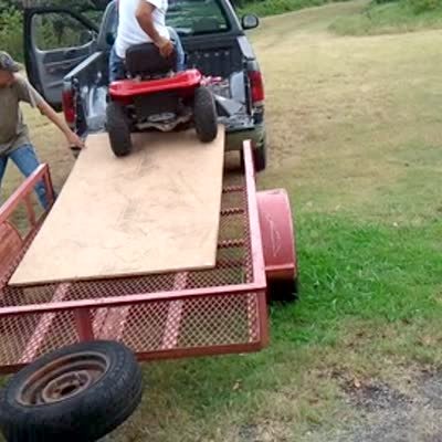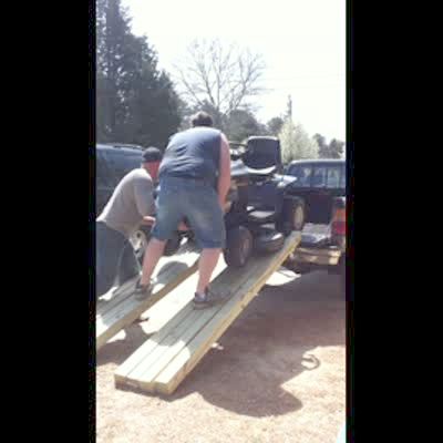 A man tries to back a lawn mower off a truck bed into a trailer with a wooden board as a ramp. The board falls down and the man falls backwards off the truck into the trailer. The lawn mower falls on top of him. Two men help take the lawn mower off him. Poor framing.