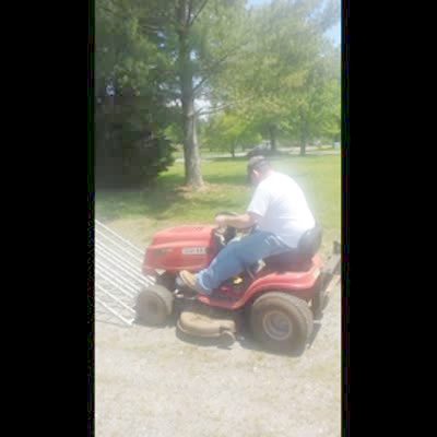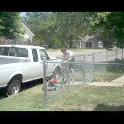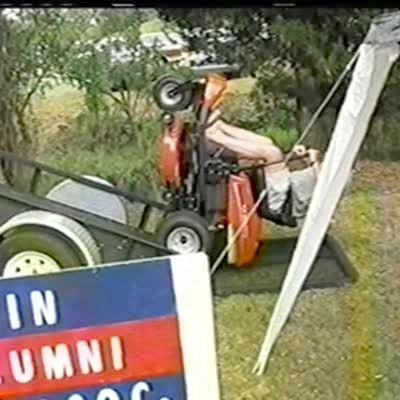 Man backing a lawn mower off of a trailer decline falls backwards when the ramp buckles. Doesn't have more heads than orig. submission - has titles instead. Short tail - camera goes off man after fall