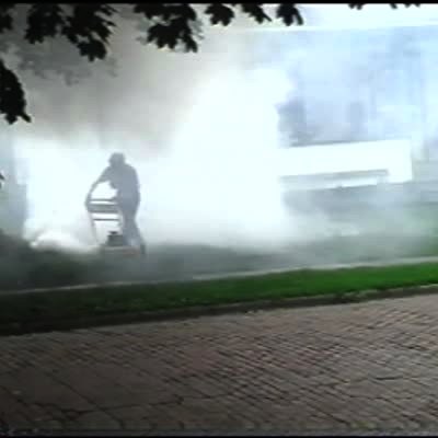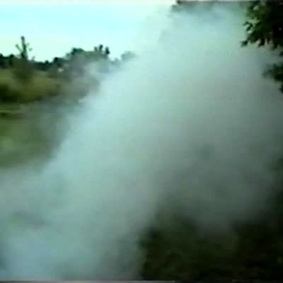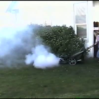 Man mows his lawn. His lawn mower is blowing huge amounts of smoke. His neighbors complain but he keeps mowing. The smoke is so thick you can't see him.