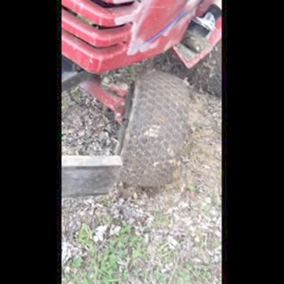 A man is trying to load lawn mower onto back of pick up truck up some 2x4s. He gets the mower in and then falls off of the 2x4s.