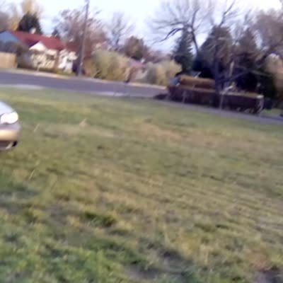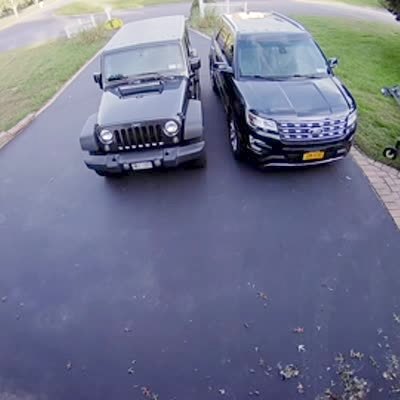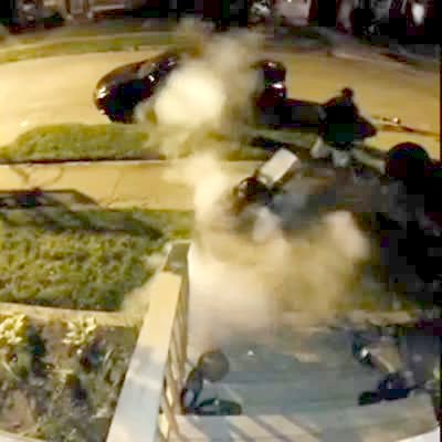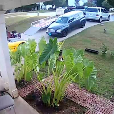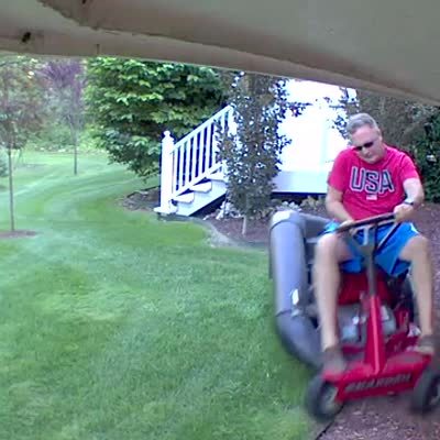 Home security footage of a man who knocks over a lamppost in the front yard with his lawn mower.