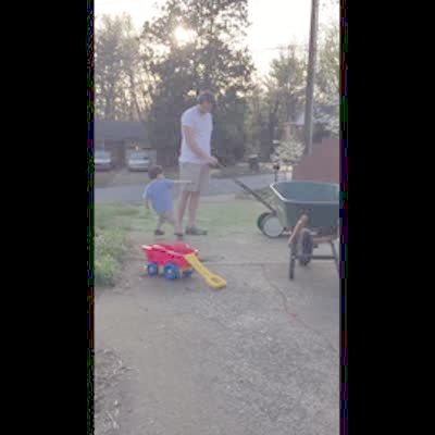 Boy lies on a lawn mower with clippers in his hands and cuts the grass as dad pushes him. They changes places.