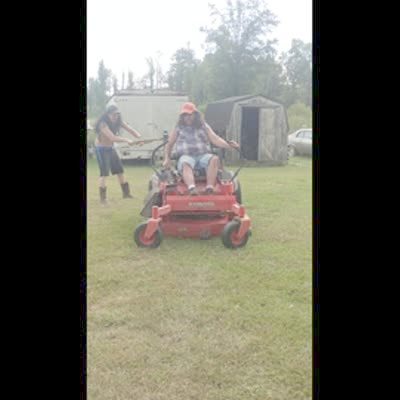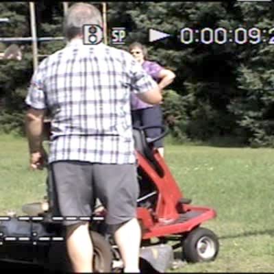 Man rides a tractor lawn mower in the backyard with a girl on his lap. They hit a tree when man is not paying attention & looking at the camera. Girl cries. Bonehead.
