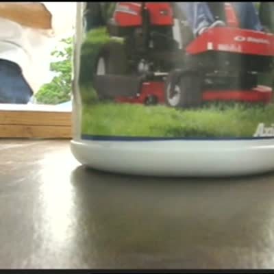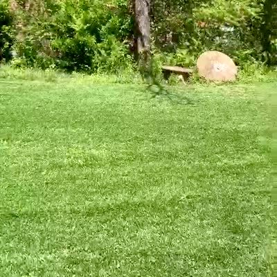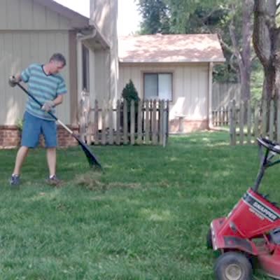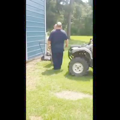 In a backyard, a senior man starts a lawn mower with a ripcord. The lawn mover drives forward, destroying a wooden bench in its path. Man runs after it and is able to stop it before it reaches the woods. Short tails.